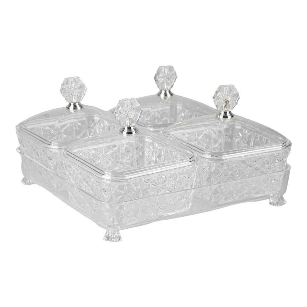 مجموعة تقديم للمكسرات و الحلويات أكريليك من سوليتير , مربع حجم ,يحتوي على 4 صحون داخل الصحن الأساسي , شفاف , الطول 17 سم , العرض 27 سم