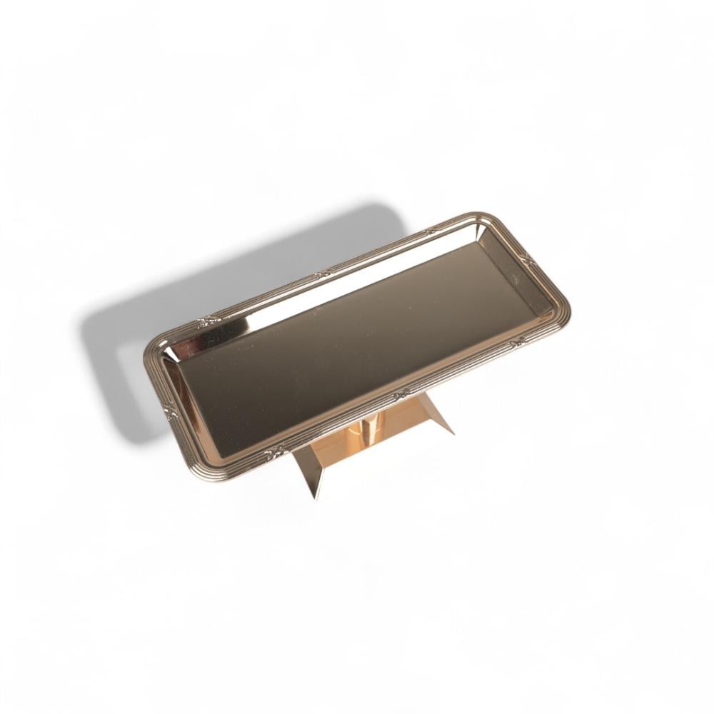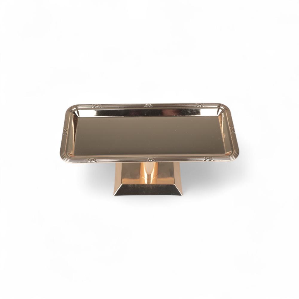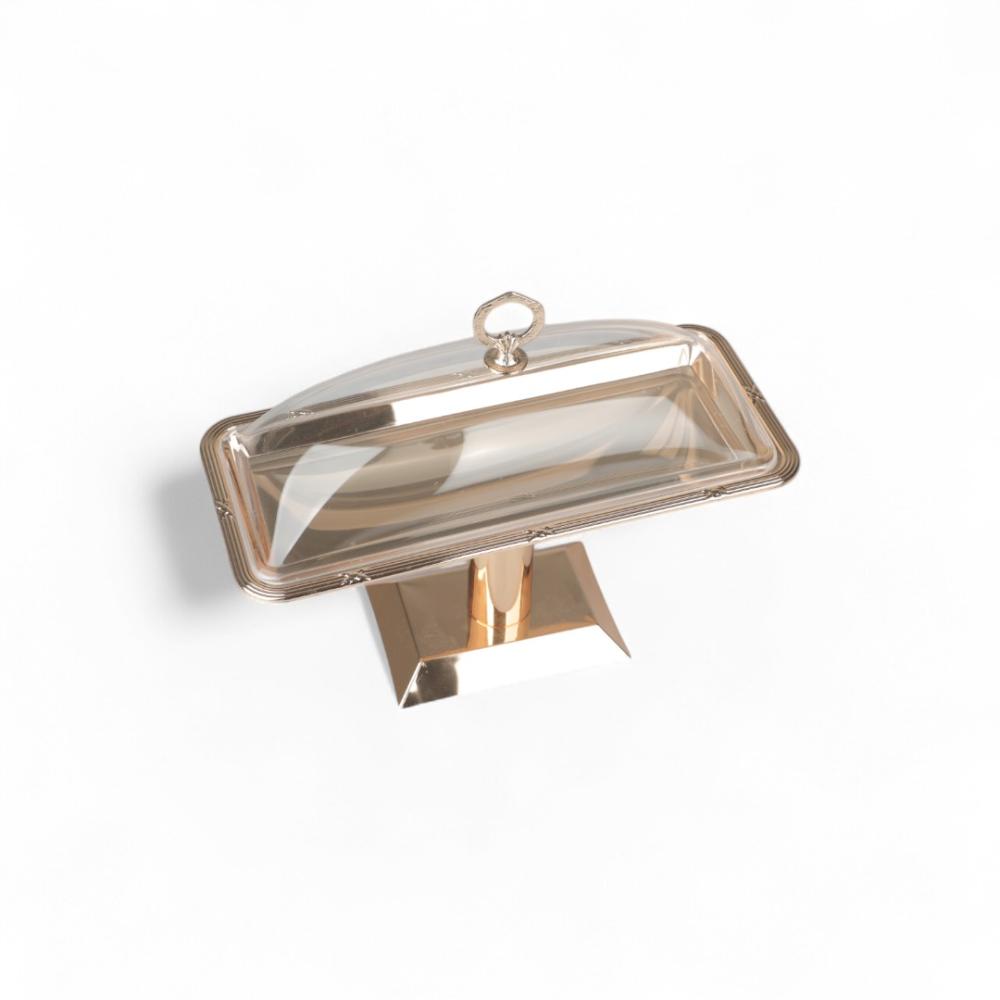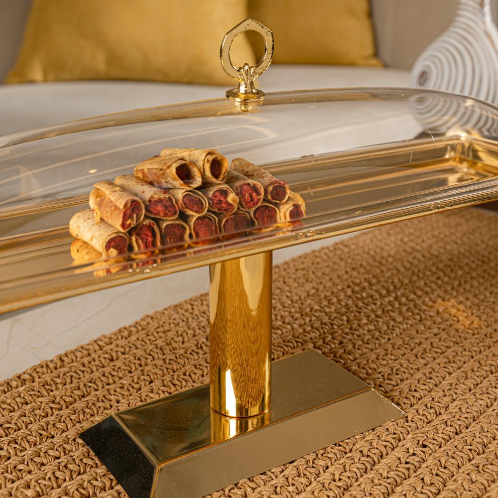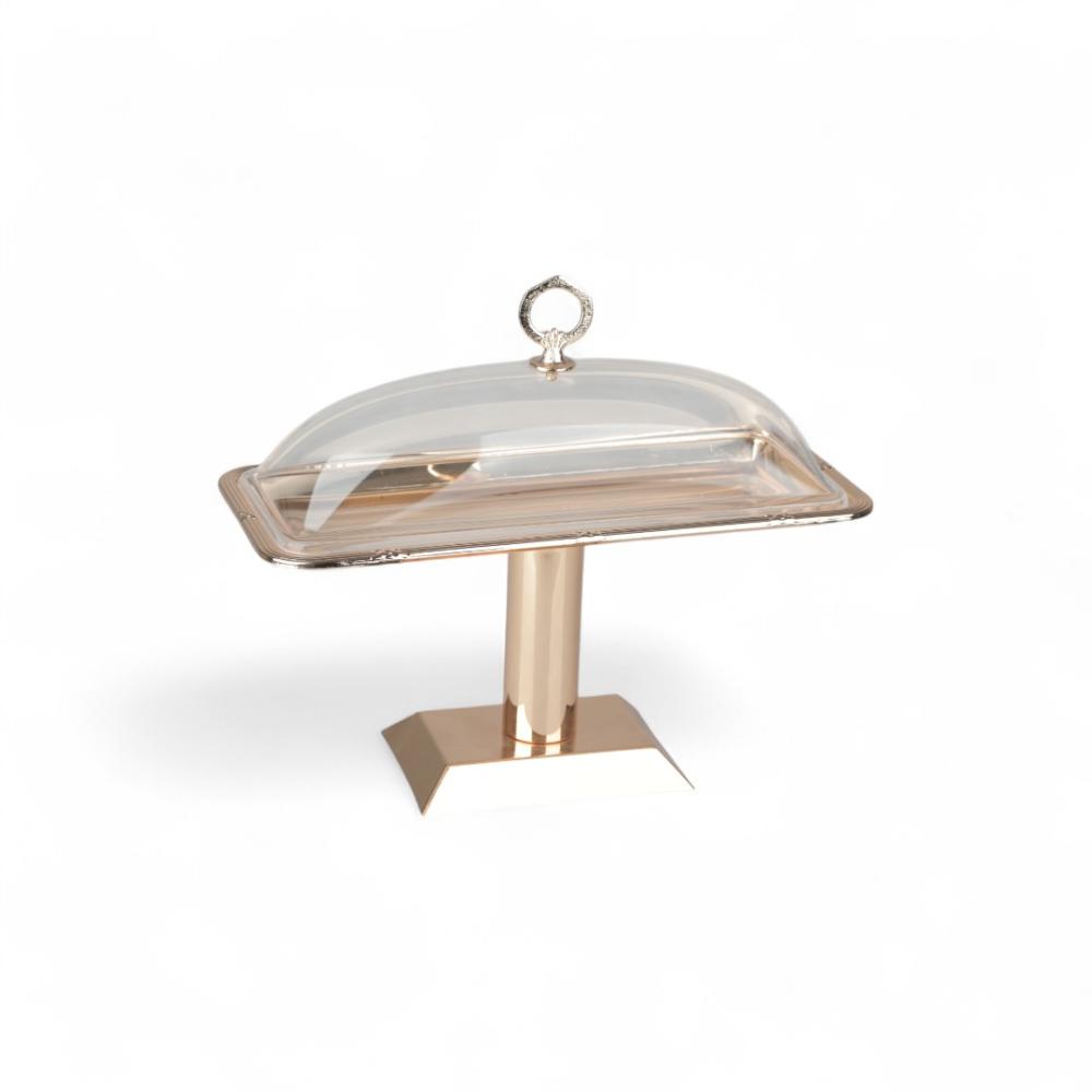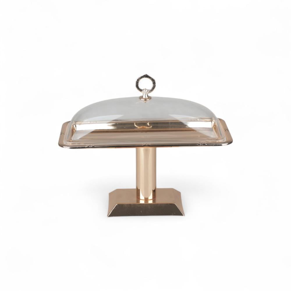 صحن كيك فوبي مع قاعدة بغطاء أكريليك من سوليتير، اللون ذهبي، الحجم صغير، الشكل مستطيل