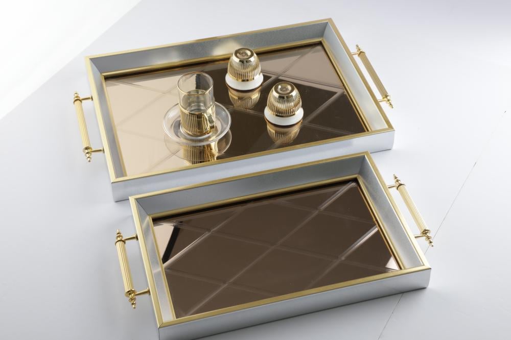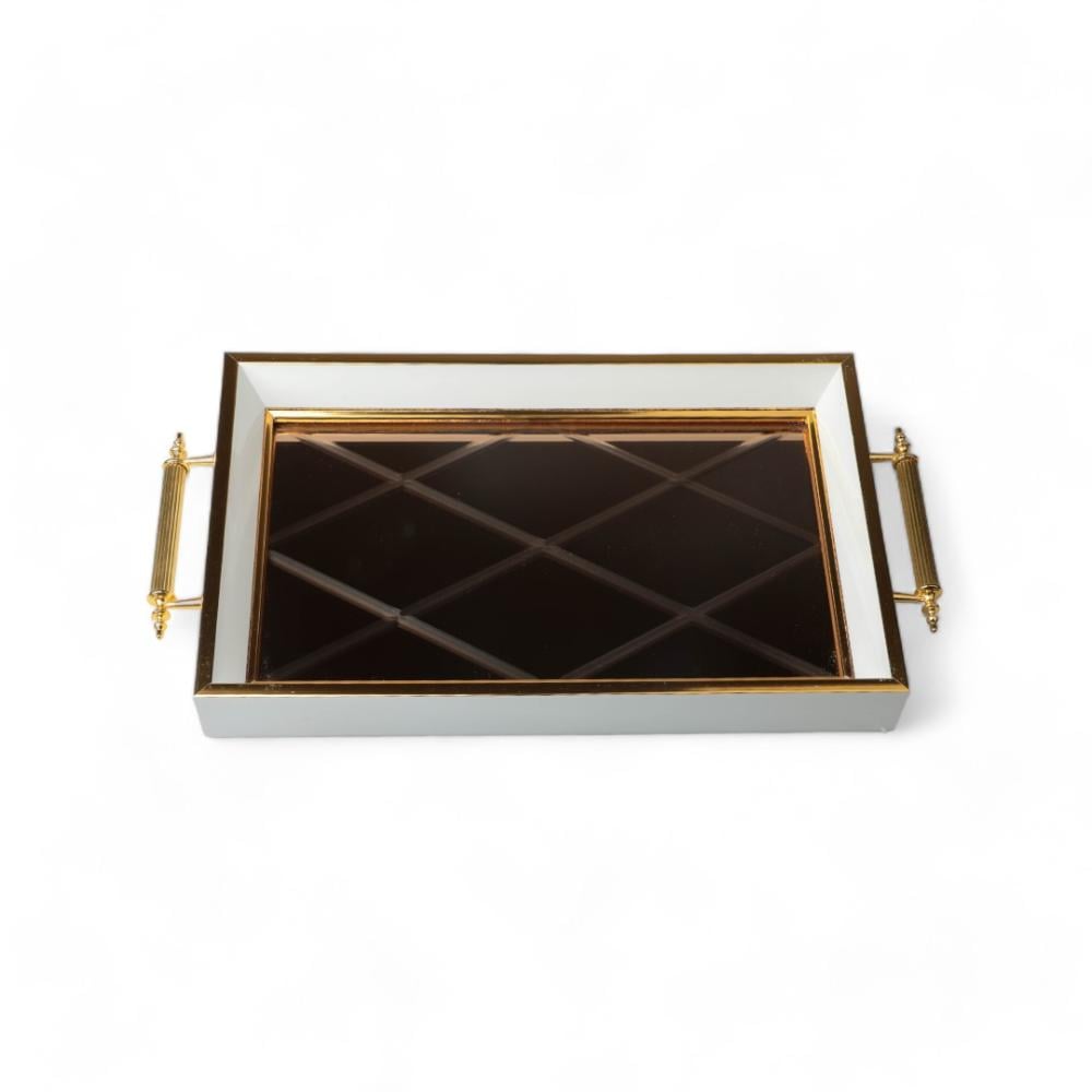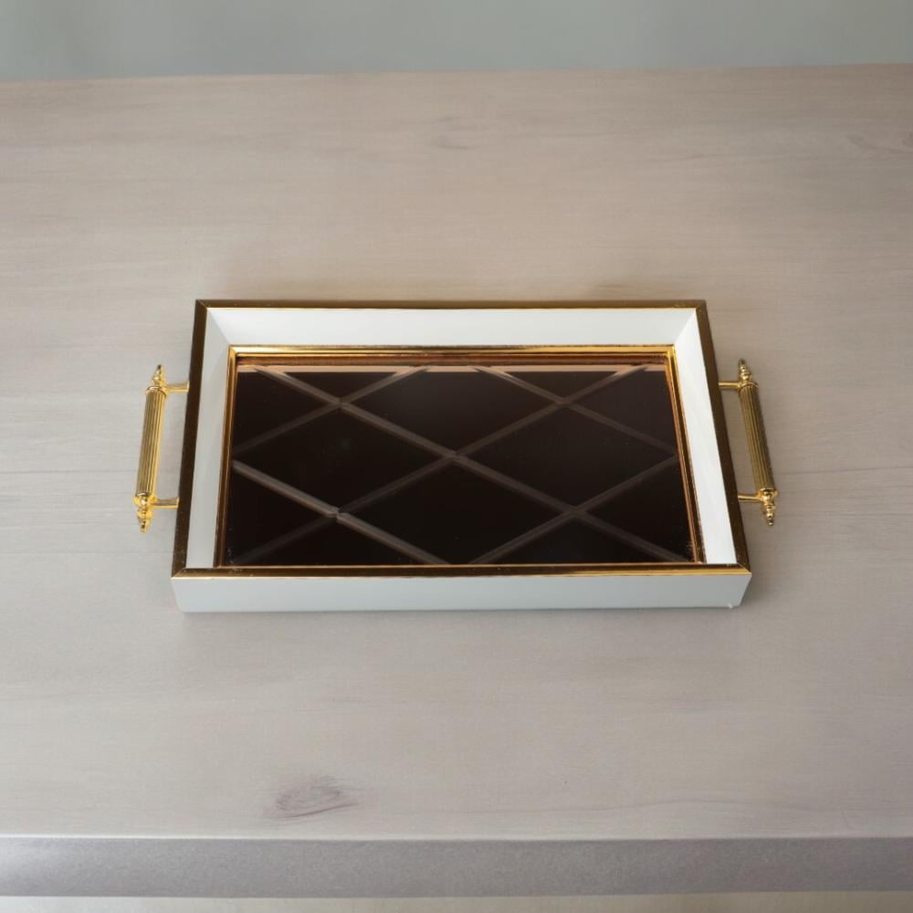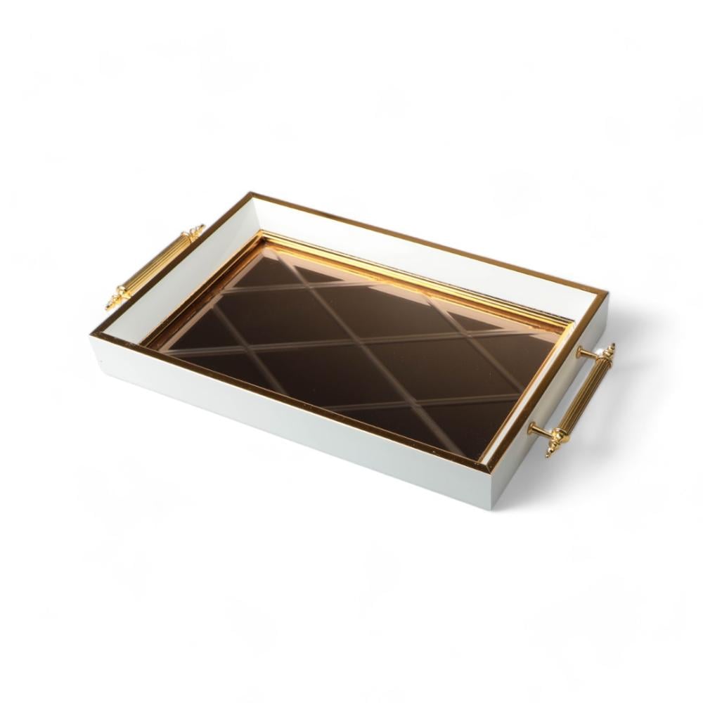 صينية خشبية بقاعدة عاكسة، أبيض ذهبي حجم كبير, الأبعاد 44x31 سم