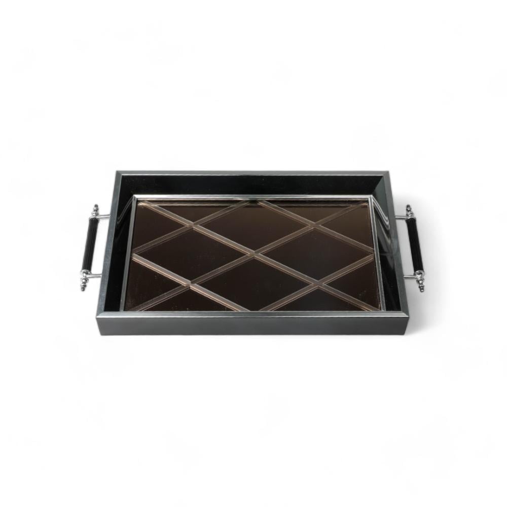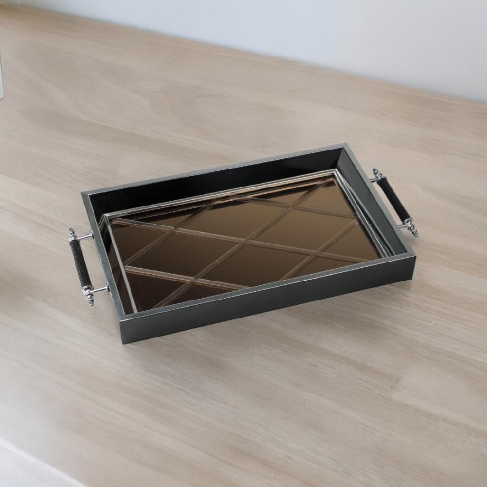 صينية خشبية بقاعدة عاكسة، لون فضي أسود حجم صغير, الأبعاد 36x23 سم